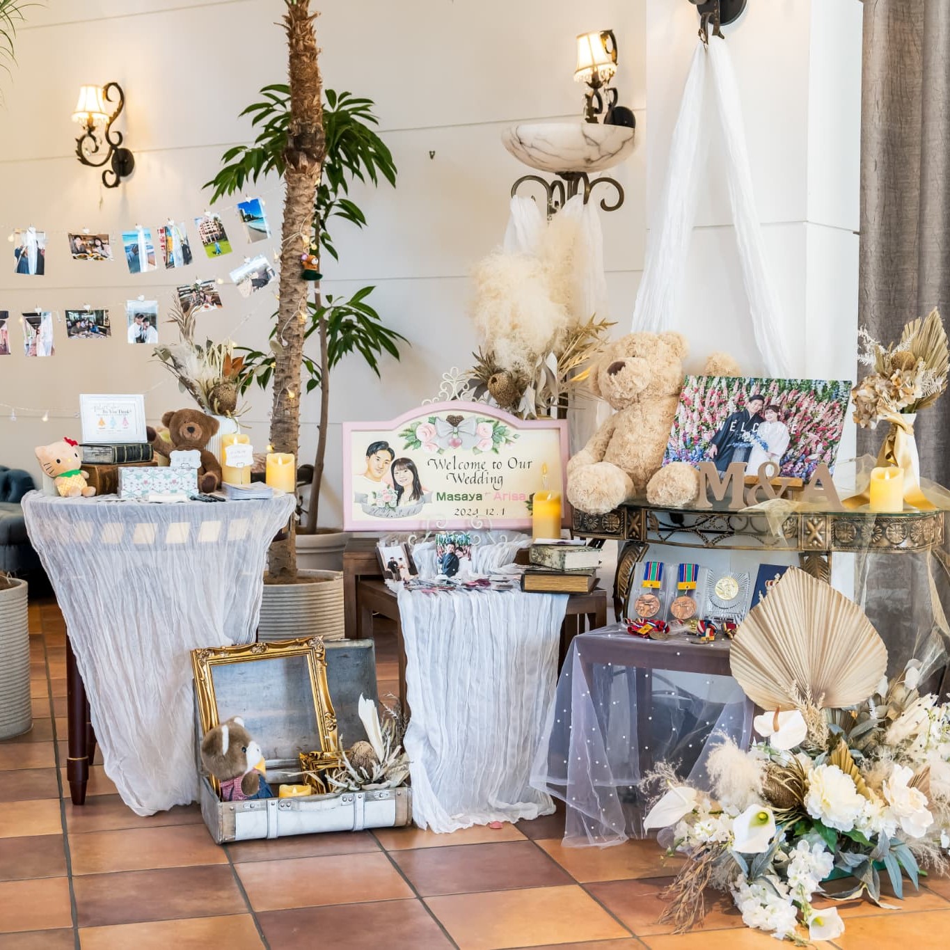 ・ウェルカムスペースは新婚旅行と前撮りの写真を並べたり、コレクションしているクマのぬいぐるみを飾ったりしました。2人の個性溢れるスペースになったと思います。