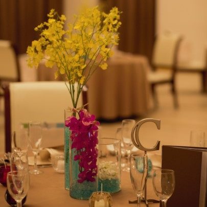ドレス。挙式は色と青のブーケでかっちりしたイメージにしました。カラードレスはレースのピンクのドレスで選んだので、可愛い感じにして、雰囲気をガラッと変えました。また、来てくれたみんなが楽しめるように、ビュッフェを取り入れたり、受付の方へサプライズでサンクスバイトをしたりしました。