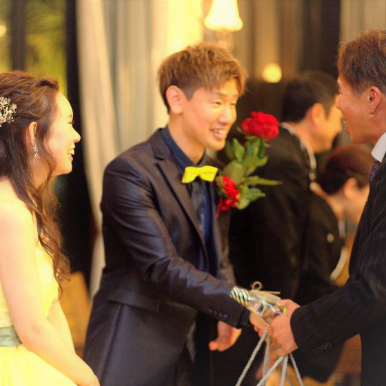 新郎はネイビーのタキシード、新婦のカラードレスはイエローにして赤い薔薇のブーケブートニアで揃えました。ゲストテーブルの装花は赤い大きな薔薇を1本飾って、周りに花びらを散らしました。装花で一気に美女と野獣感がでて、SNSに載せている友人もいて嬉しかったです(^_^)