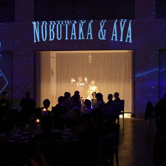 また、披露宴入場の際のオリジナルムービーでは、前撮りで撮影した写真を私達の好きなテイストで作っていただきました。何度も何度も編集をしていただき、本当に大満足の映像を作ってくださいました。ゲストで来てくれたみんなからも好評で、オリジナルムービーを流せたことは、私達の素敵な思い出です。