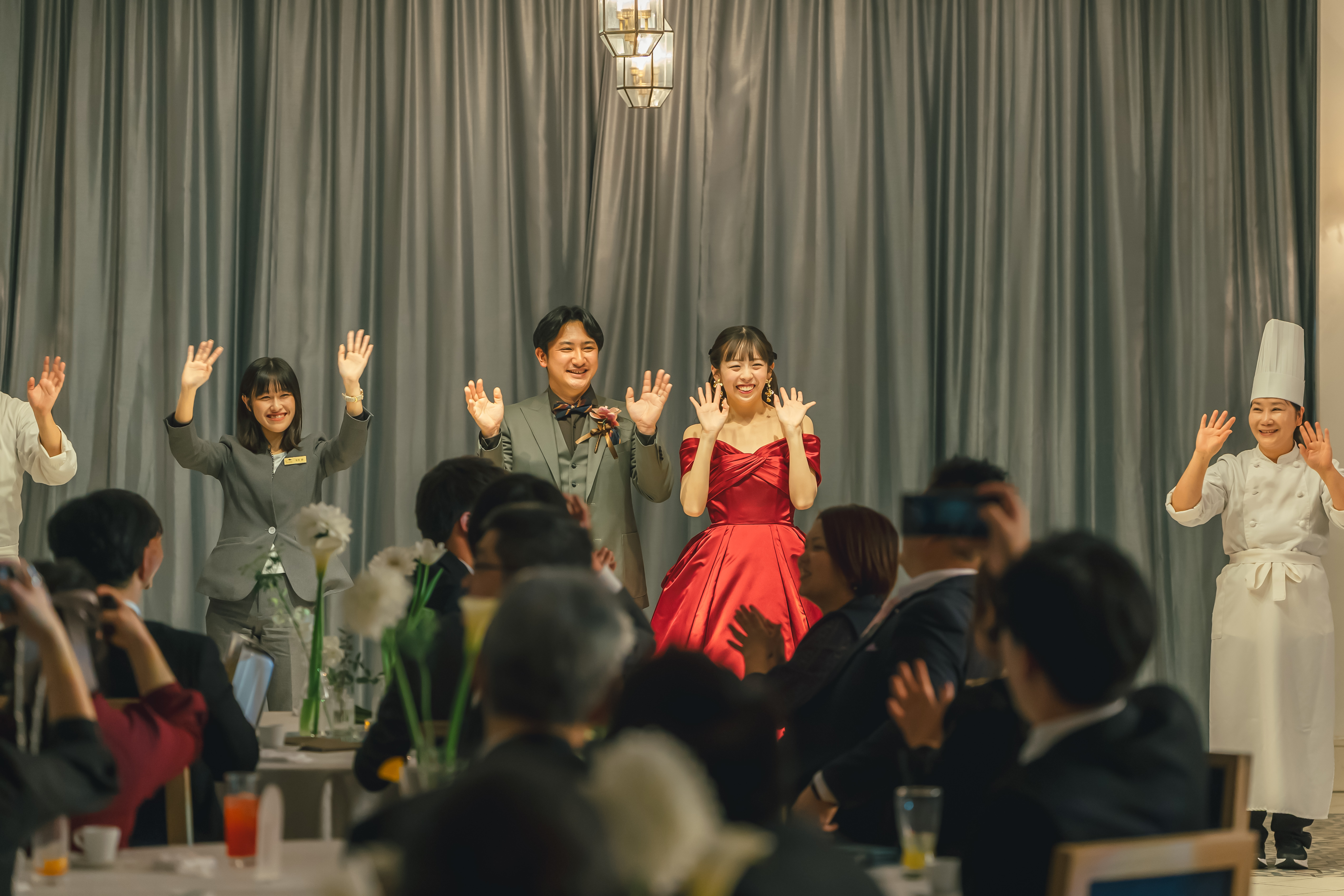 披露宴ではゲストからのサプライズも数多く、おふたりの門出を心より祝福する皆様の熱い想いに包まれた一日となりました。おふたりの登場で会場のボルテージは瞬く間に最高潮に達し、溢れんばかりの歓声が響き渡りました。幸せそうに微笑むおふたりと、それを見守るゲストの笑顔が溶け合い、会場全体にこの上ない一体感が生まれました。