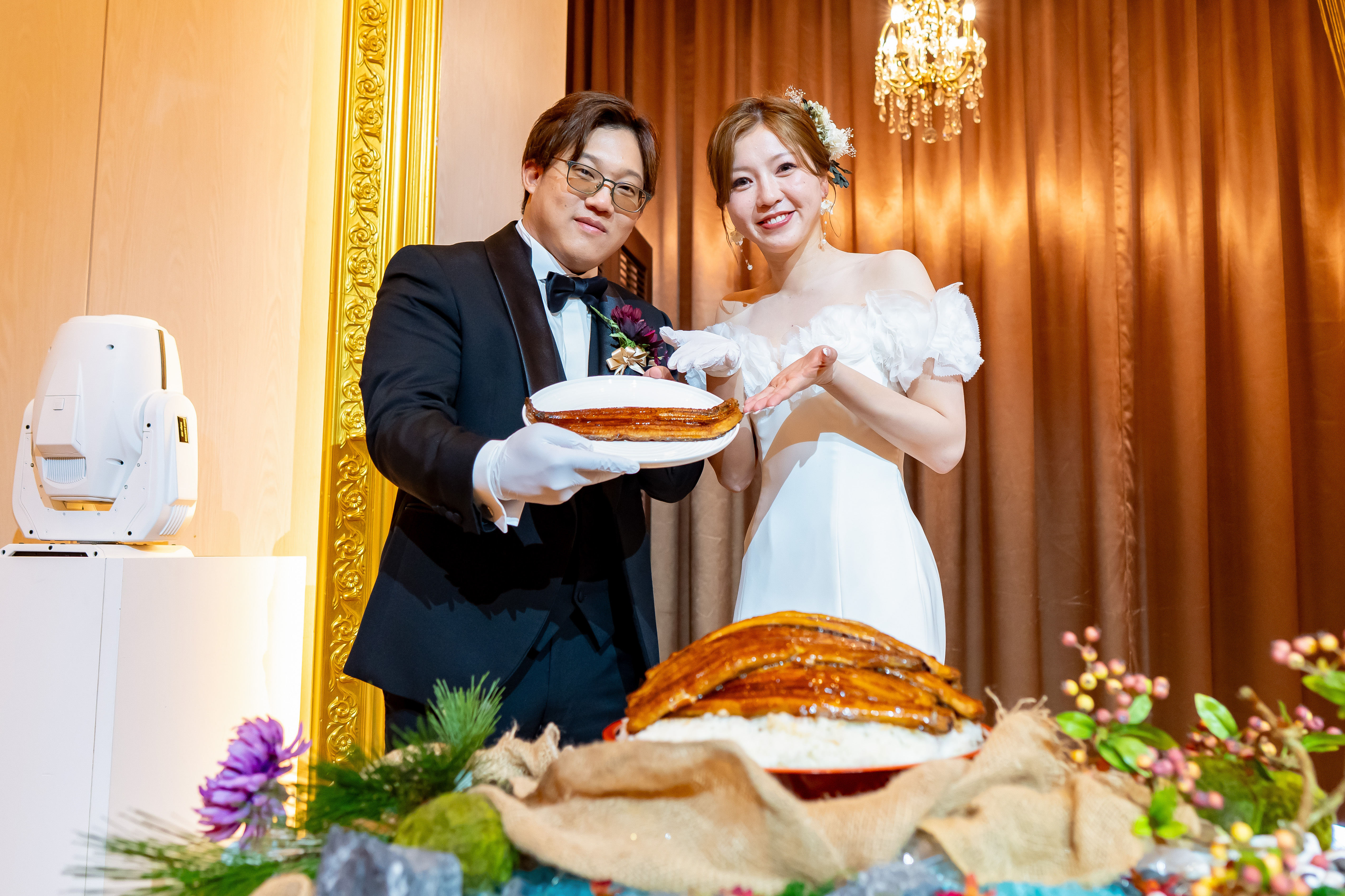 初めての共同作業であるケーキ入刀は...大きなどんぶりの上に鰻を乗せ、たれをかける完成セレモニーに。