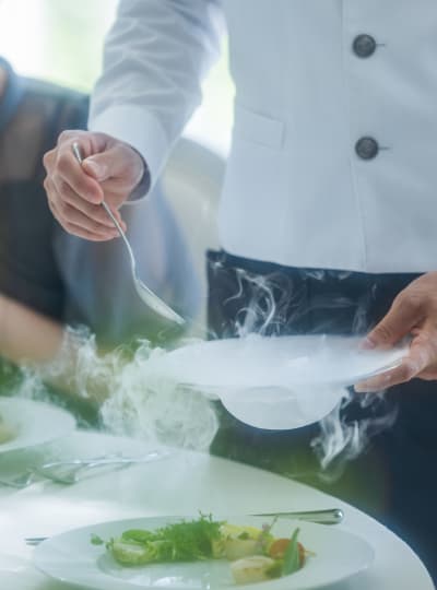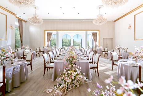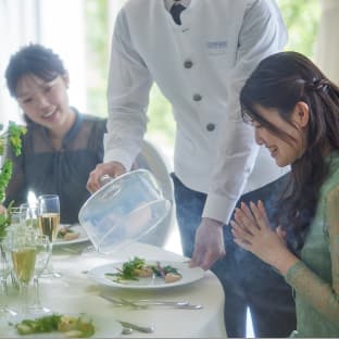 ラウンジやテラスを使ったカジュアルな空間で、少人数ウエディングにふさわしい時間をお過ごしください。ホームパーティーのような感覚で緊張が和らぎ、自然体でゲストとの会話を楽しめます。 お料理は、 地元の旬の食材を生かした”フレンチジャポネ”を、お食事の進み具合に合わせ、最も美味しい状態でお料理をご提供します。 完全バリアフリーにも対応しておりますので、お子さま連れやご年配のゲストにも安心してお過ごしいただけます。