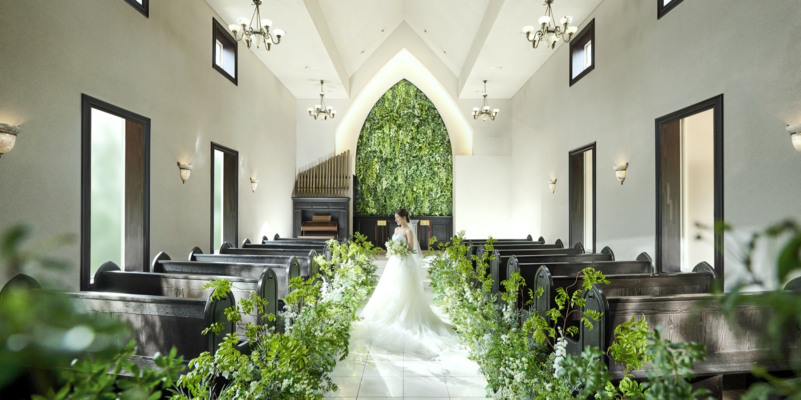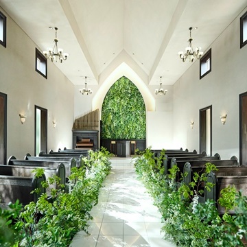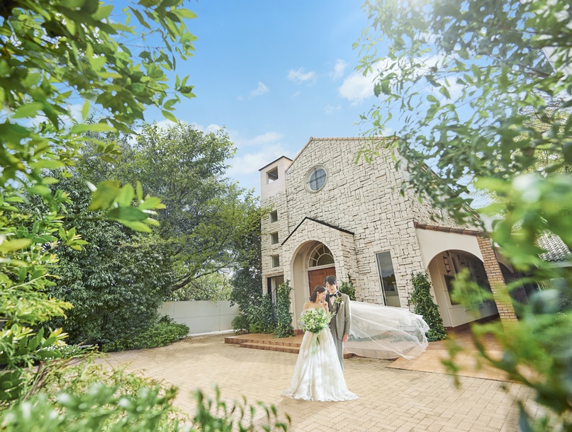 美しい緑のガーデンに囲まれた、白亜の邸宅と石造りの独立型チャペル。