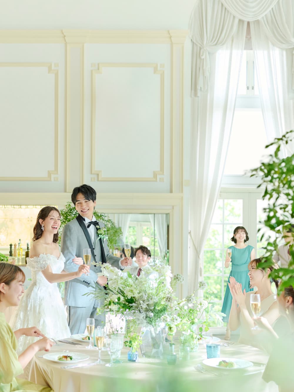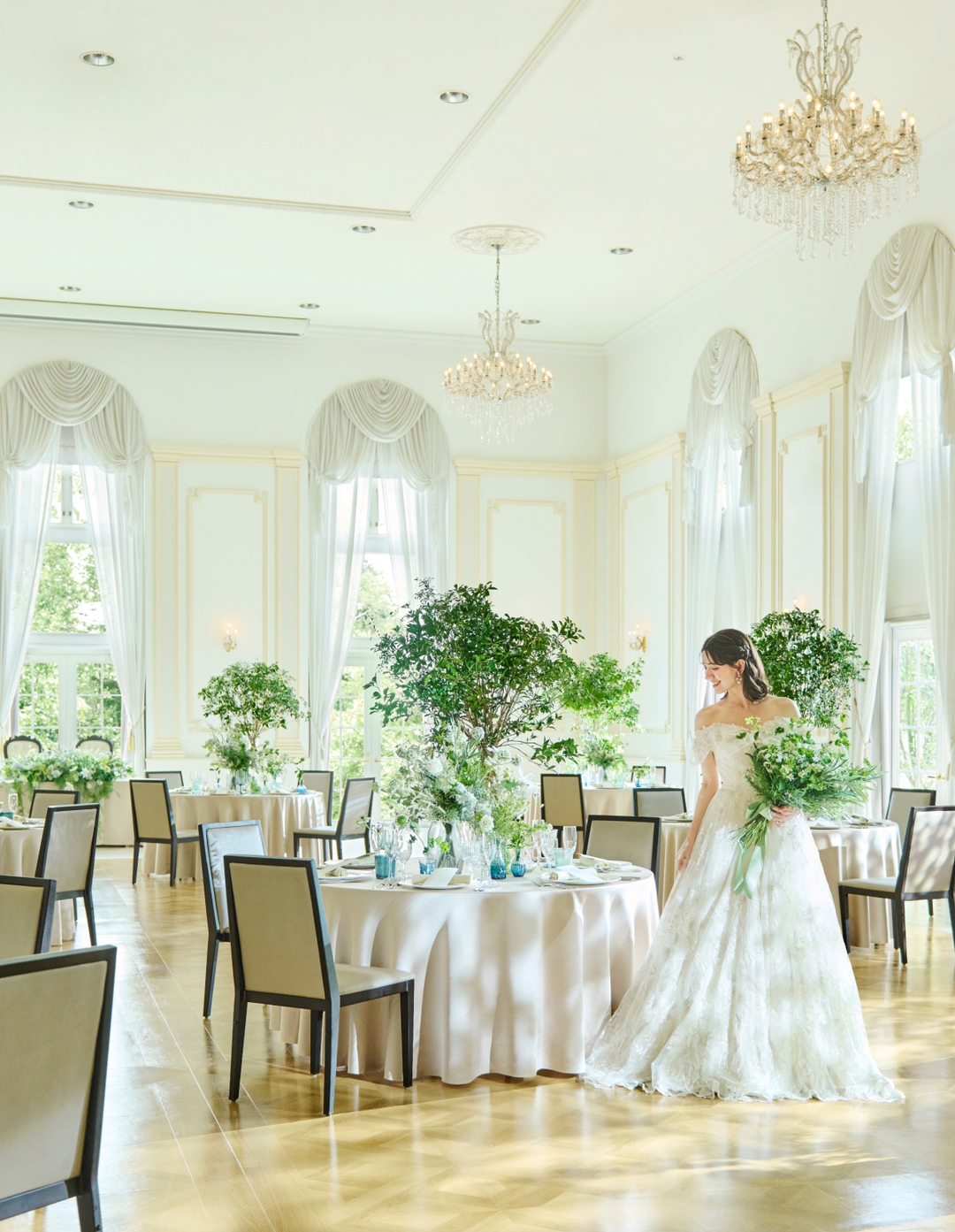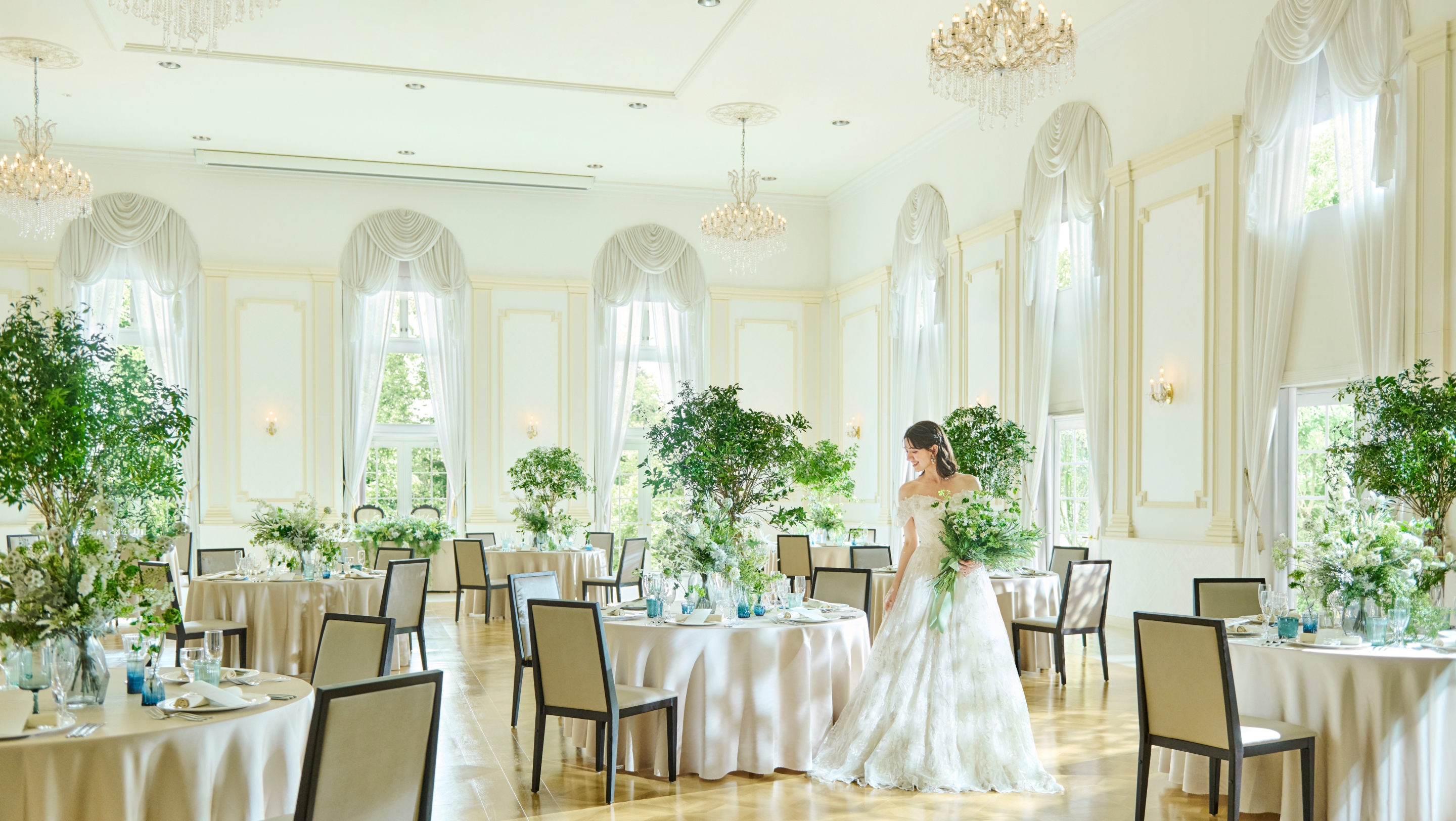 やわらかな自然光があふれる上質な空間に優美なシャンデリアが彩りを添える、輝きに満ちたバンケット。ひとつながりのガーデンも使って、おふたりらしい自由な演出をお愉しみいただけます。