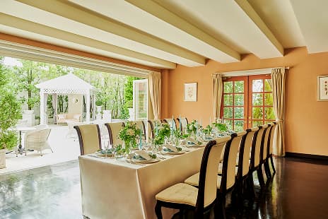 バンケットの前には、グランドピアノも備えた広々としたラウンジをご用意しております。また、バンケットの窓を開けると、青空の下、爽やかな風を感じながらリゾートのようにくつろげるガーデンがあります。邸宅の隅々まで貸切で自由なパーティースタイルを叶えられるのも魅力の一つです。