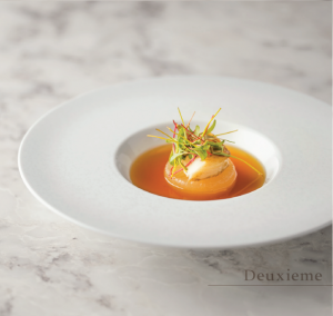 低温調理することにより柔らかく仕立てた鮑。弱火でじっくり煮込んだ大根。異なる柔らかさのコントラストを鶏と牛、二種類のコンソメをブレンドし、香りや味わいがより一層深いコンソメドゥーブルでお楽しみください。