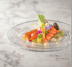 優しく火入れしコンソメのヴェールを纏わせたオマール海老に香り豊かなカリフラワーのムース、食感楽しいクスクスのサラダを合わせ、フランス産最高級キャビアをあしらいました。