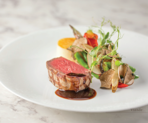 当会場で厳選いたしました黒毛和牛のヒレミニョン。おおよそ、800kg~1tもの大きさの牛から約3%しか採れない希少部位を使用します。網焼きにすることにより余分な脂を落とし、旨味を凝縮。伝統的な黒トリュフのソースをあわせ至高の一皿に仕上げました。和牛の柔らかさ、旨味、芳醇なトリュフの香りを楽しみつつ、テレビでも紹介されたことのある長谷川農産のマッシュルームとのマリアージュをご堪能ください。