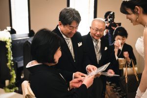 そして大切な親御様に今までの感謝の気持ちを込めて、お二人のお支度が整った姿を誰よりも1番先に親御様だけに見て頂く「ペアレントタイム」でお二人手作りの感謝状をプレゼントしました!お二人の親御様は扉が開いた瞬間、お二人の姿を見た瞬間に大号泣。「結婚式を挙げれてよかったね」「娘を宜しくお願いします」「今まで育ててくれてありがとう」今までの”ありがとう”の気持ちをご自身の言葉で伝えていらっしゃいました。