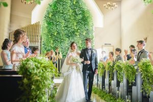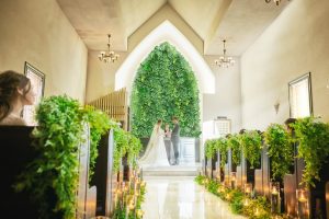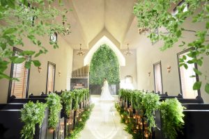 ナチュラルグリーンに囲まれた天井高6mのチャペルは、