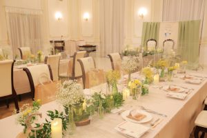 会場のテーブルセットは、長テーブルや円卓など皆様のご希望に合わせてご用意しております。卓上のパーテーションもゲスト様の人数の分だけ確実にご用意できますので、ご検討されていらっしゃる新郎新婦様は遠慮なく会場スタッフまでお問合せくださいませ。
