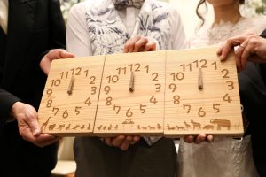 木目がつながる三連時計は、プレゼントした後もずっと使える実用的な贈り物であることも魅力のひとつ。それぞれのご家庭で、3つの時計が同じ時を刻み続けます。新郎様と新婦様が、それぞれのご両親と共にこれまで重ねてきた年月。おふたりが出会い、ご結婚されるまで歩んできた日々。そして、新たに生まれる家族とそれぞれのご両親、3つの家族が新たな絆と共に過ごしていくこれからの年月。