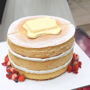 鮮やかなイチゴと大きなバターが載ったパンケーキの登場で