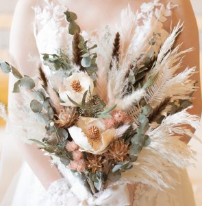 今トレンドのくすみカラーで統一されたドライフラワーのブーケ♡