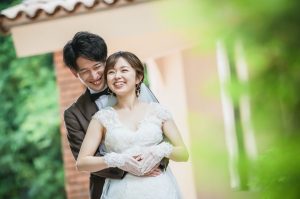新郎様からのバックハグに照れくさそうに笑顔な新婦様♡