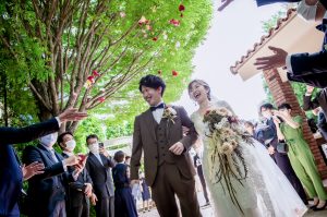 フラワーシャワーの際に皆様から祝福を受けるおふたりも
