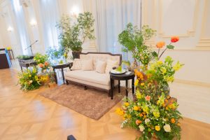 エヴァウイン小山プレミアムスィーツではメインテーブルを置かずに、ソファ席にしお花をコーディネートする【高砂ソファ】がとっても人気です!