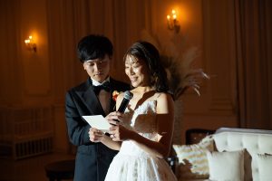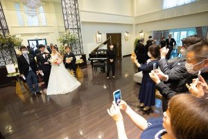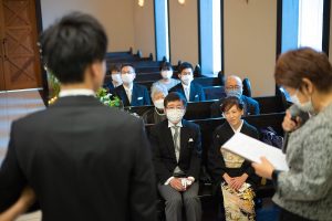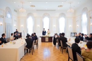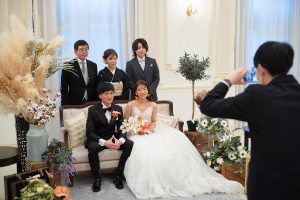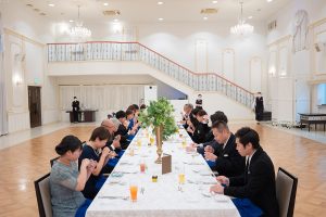 結婚式を行うのは、自分たちというより「祖父母のためにしたい!」というご希望のおふたり。また祖母への配慮も大事にしたいという親孝行なおふたりでした。何かたくさんのイベントなどをするのではなく、会食を中心とした食事会、そして思い出に写真をいっぱい撮りたいというご希望でした。幼いころから近くで成長を見守ってくださったご家族・ご親族と思い出を振り返るような時間をつくり、集まったみんなで、楽しく食事を囲み、写真撮影をメインにたくさん思い出に残る一日にしたいからこそ、平日でご結婚式の後にゆっくりと館内撮影が行えるプランを選ばれました。結婚式当日はまさに少人数だからこそ、近い距離で一人ひとりと顔と顔、目と目を合わせながら自然と笑みがこぼれる素敵な結婚式になりました。