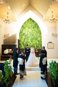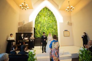 チャペルで多いスタイルといえば「白亜の白い教会」多いですよね。私たちエヴァウイン小山プレミアムスィーツは白い教会ではなく、あえて緑一面に広がる5mを超えた規模のウォールグリーンの緑にあふれたチャペルです。