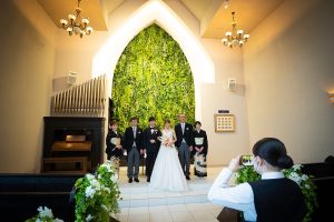 おふたりや「ゲストからの目線」で映る光景と、「写真や映像でカタチに残る光景」では印象が全く異なります。美しいドレス姿を残せるのは、色被りをしてしまう白いチャペルではなく、純白のウエディングドレス姿と差し色になり、より際立つ緑にあふれたチャペルが印象・思い出にも一番色濃く残ります!