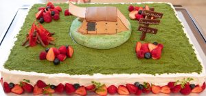 これはなんと巨大なバームクーヘン!輪切りにする前はこのような形をしているんです!それを使って文字を書いたり、クリームを塗ったり、フルーツを置いて可愛くアレンジを!