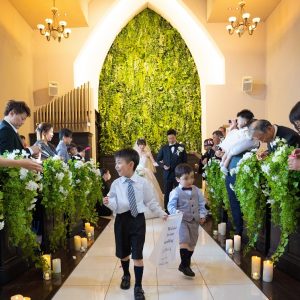 フラッグボーイ&フラッグガール!挙式の入場や退場のときに、お子様に挙式日やお名前、参列するゲストに向けたメッセージが書かれたフラッグをもっていただき、先導していただくお役目です。扉が開いた瞬間や退場していくときに「わぁーかわいい!」とゲストからお声が飛び交っているのが想像できますね!