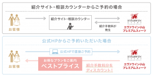 結婚式の実施費用において最安値のプランをご案内します。式場紹介・相談カウンターからのご予約、式場比較サイトなど、インターネットサイトからのご予約に比べて当公式ホームページでご予約いただくと、仲介紹介料がかからないため、お客様に100%還元することができます。