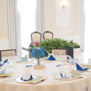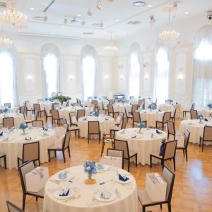 披露宴会場は、広々とした空間で最大150名様まで収容可能。お二人のイメージに合わせて、様々なレイアウトが可能です。
