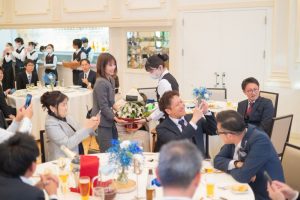 今回の結婚式のご招待人数は80名ほど。会場のスペースにも余裕があり、ゲストの間をドレス姿で歩むときも綺麗な姿をゲスト様にお見せすることができます。