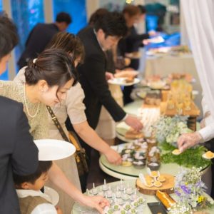 披露宴中にサプライズデザートが!貸切会場だからこそ、ラウンジルームにブッフェコーナーを設けて、みんが嬉しいデザートブッフェの開始です♪種類が豊富なデザートからぜひお好きなものをお選びください♪