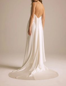 深く、広いカッティングのオープバックのデザインに流れるリボントレーンが背中を飾り都会的な印象でお召 いただける 1着です。
