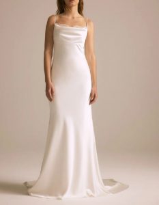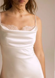 注目のトレンドディテールである華奢なスパゲッティストラップデザインの1着。