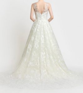 スカートの裾元にかけて流れるようにデザインされたレースにはスパンコールを重ね柔らかい煌めきで花嫁を包み込みます。