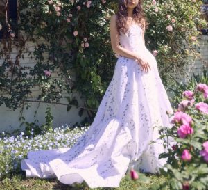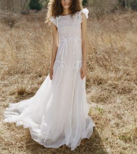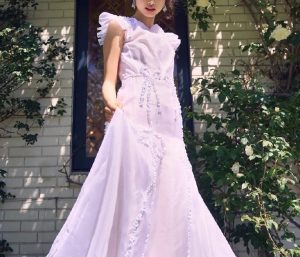 息を呑むほどの美しいシルクオーガンジーにハンドメイドで施された繊細なフラワーモチーフを咲かせたロマンティックな1 着です。