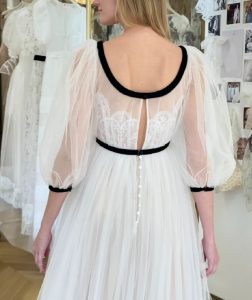 ロマンティックな印象になりやすいふんわりと広がるスカートや、空気を含んだ大きなバルーンスリーブもブラックリボンがアクセントになることで大人フェミニンなブライズスタイルを叶えます。