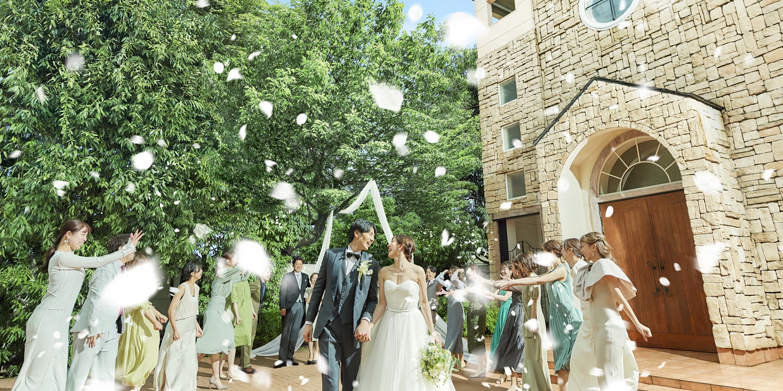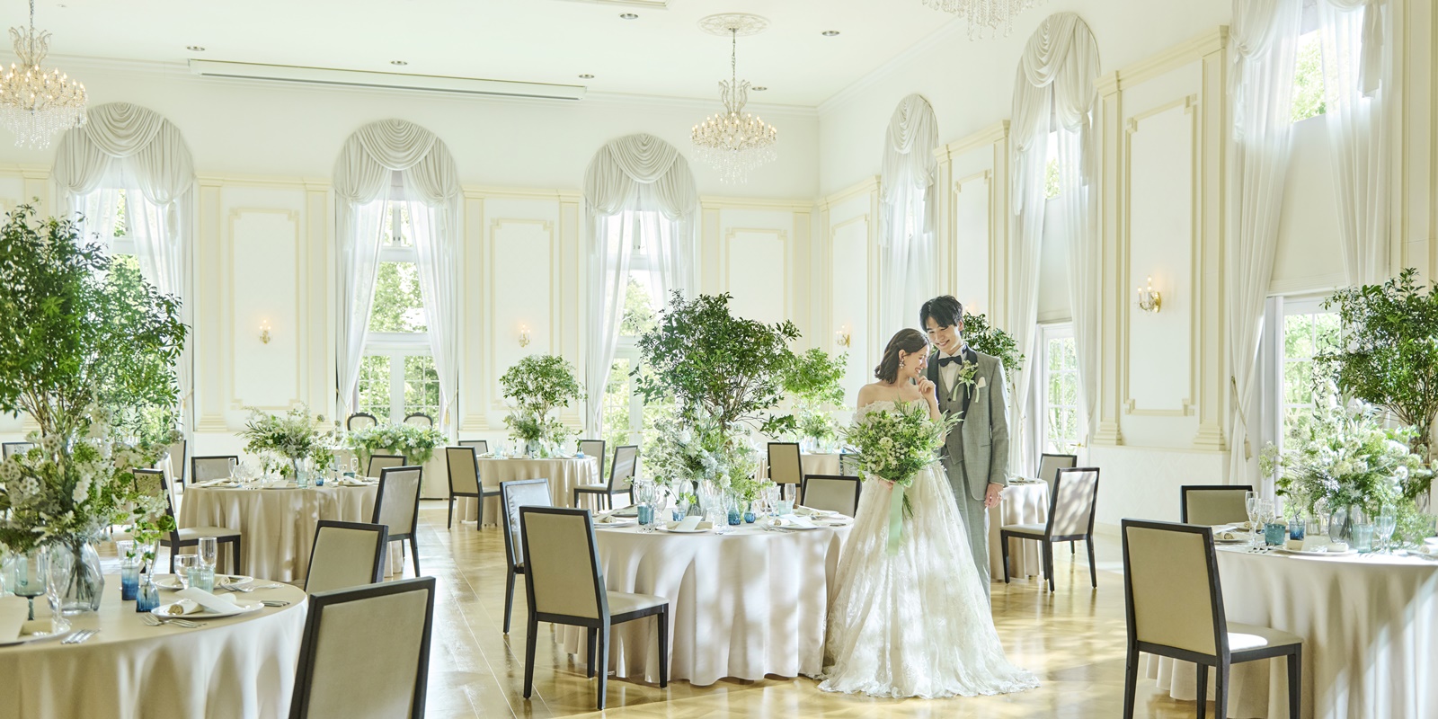 青グリーンに包まれた空間が、純白のウエディングドレスをより際立たせてくれます。