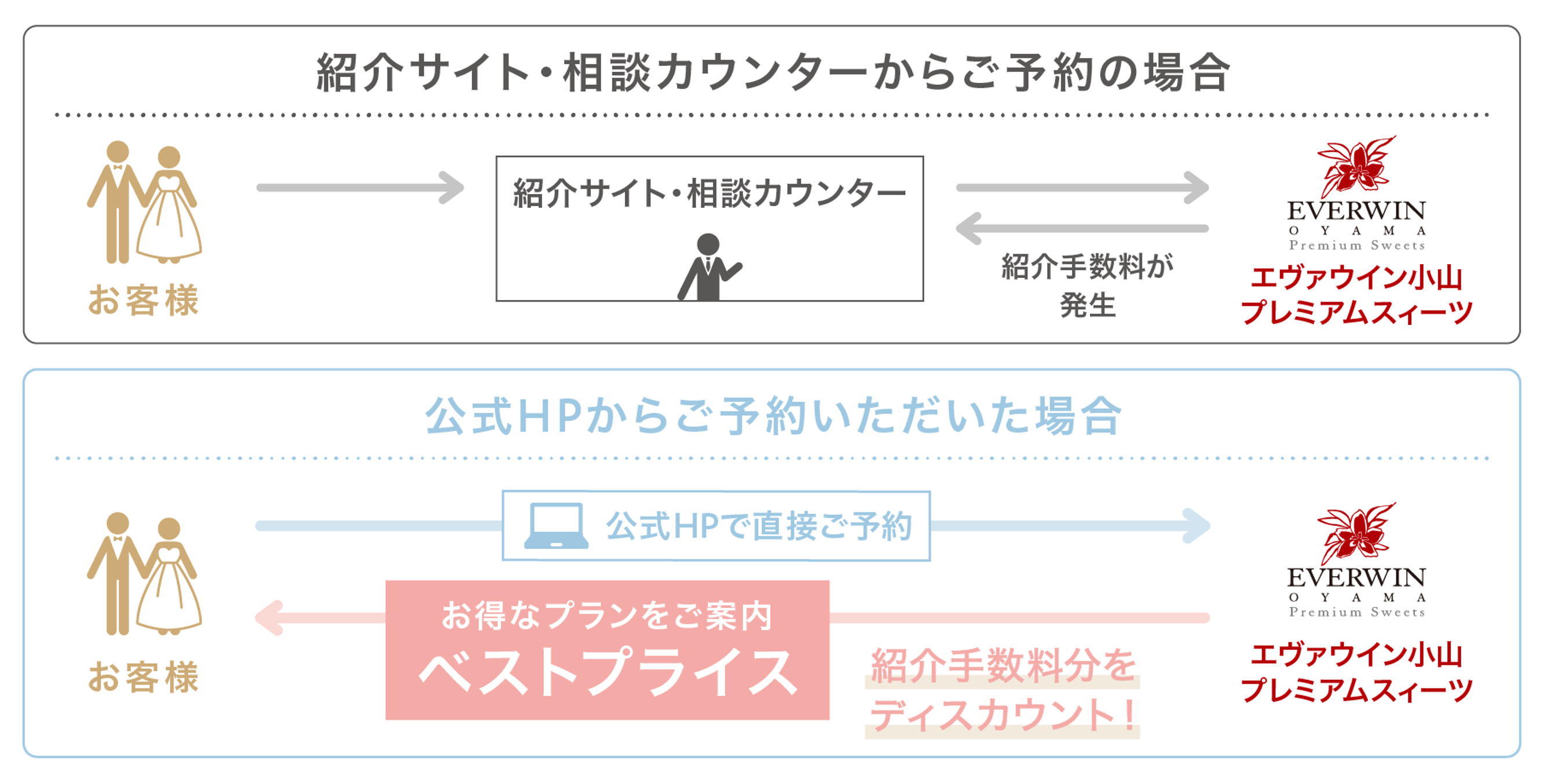 式場紹介・相談カウンターからのご予約や式場比較サイトからのご予約に比べて、当公式HPでご予約いただくと仲介手数料がかからないため、お客様に100%還元したプランをご案内することができます。