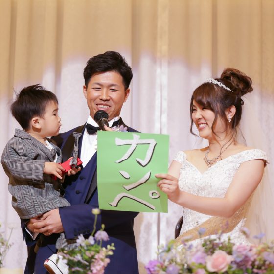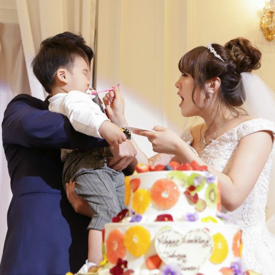 子連れ婚であることや、ゲストが親族と友人のみであることから、アットホームでゲストが楽しめる披露宴をテーマに考えました。そこで、乾杯発声をお子様ゲストにお願いしたり、ファーストバイトでは息子も一緒に参加したことで和やかな雰囲気になったと思います。