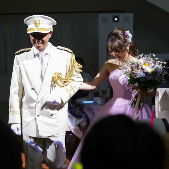 カウントダウンでカーテンが開くと、ゲストの皆様が温かい拍手と笑顔で出迎えてくれて、とても嬉しかったです。一歩一歩進むたびに、親族や大切な友達の顔が見え、自分たちのために皆が集まってくれていると思うだけで涙が出そうになりました。