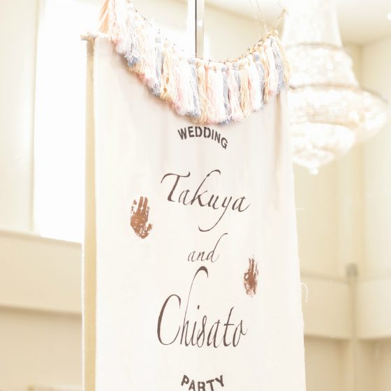 手作りタペストリーを披露宴開始前は受付エントランスの場所に飾ってもらい、終了後はゲストが帰るのに通る場所の木に吊るしてもらい、ちょっとしたフォトブースになるようにしてもらいました。実際にタペストリーと写真を撮ってくれたゲストがいて嬉しかったです。