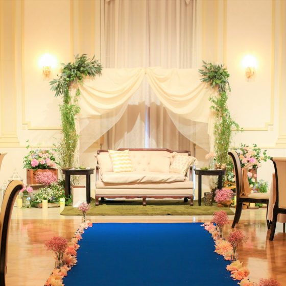 会場内にプランナーさんの提案で、ブルーのバージンロードをひいて挙式を行う提案をいただきました。