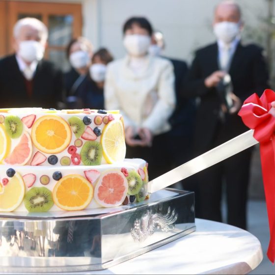 コロナの影響で挙式のみ参加になったゲストの皆様にも楽しんでもらうため、アフターセレモニーでケーキ入刀を行いました。