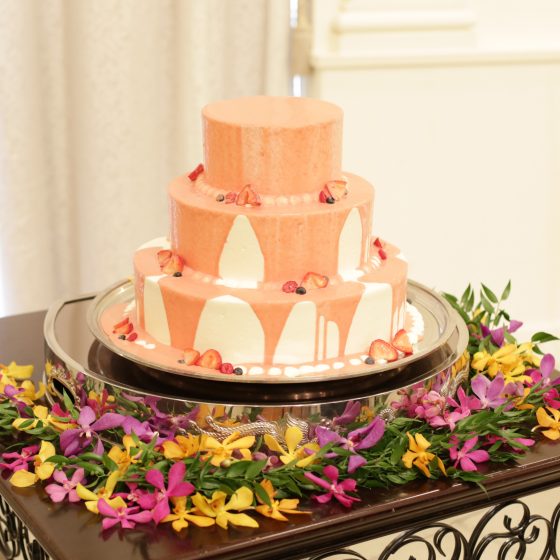 テーマは「おもてなしwedding」でした。家族、友人へ感謝の気持ちを伝えられるような内容にしたく、こだわりも沢山ありましたが、全て実現してくださいました。お料理は、旬の食材をふんだんに使い色鮮やかで見た目も味も素晴らしかったです。私達からゲストの方へのおもてなしと題してデザートビュッフェも出して頂き、こちらも大好評でした。また、個別対応にも細やかに対応してくださり、至れり尽くせりでした
