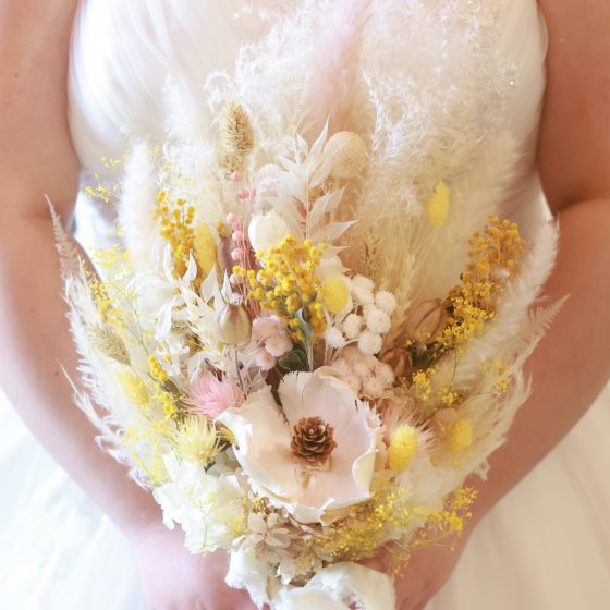 会場のお花は好きな映画の舞台であるコロンビアの街並みをイメージして、原色系のお花を選びました。