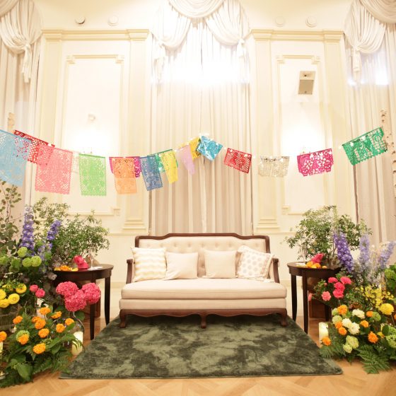 さらに新郎新婦のソファの周りはメキシコの街並みでよく見かけるカラフルなガーランドを飾り付けました。
