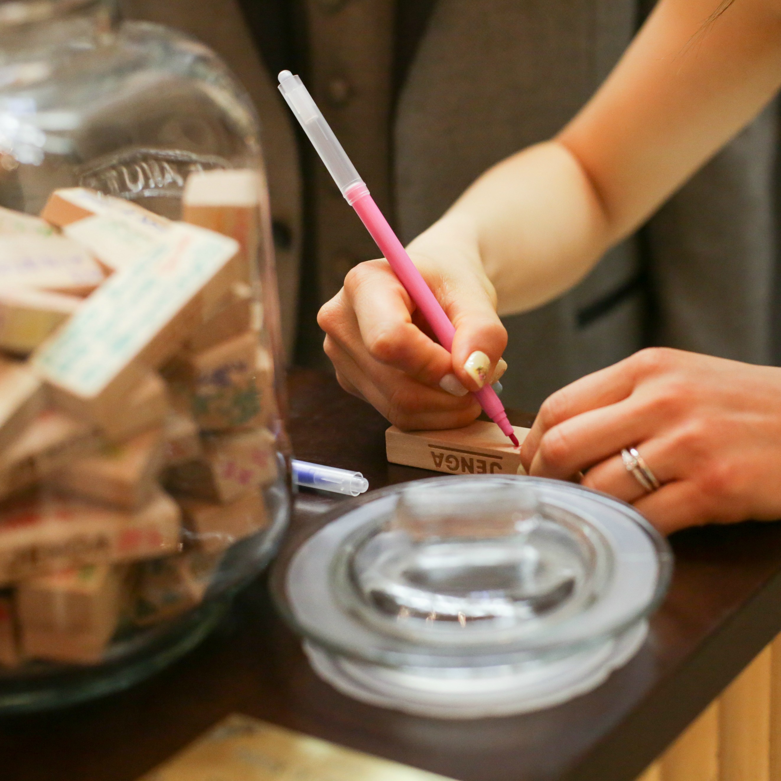 サプライズでインタビューしたり、結婚承認の証としてジェンガを使ってそこにメッセージを書いてもらったりと、参加型のイベントも取り入れました。