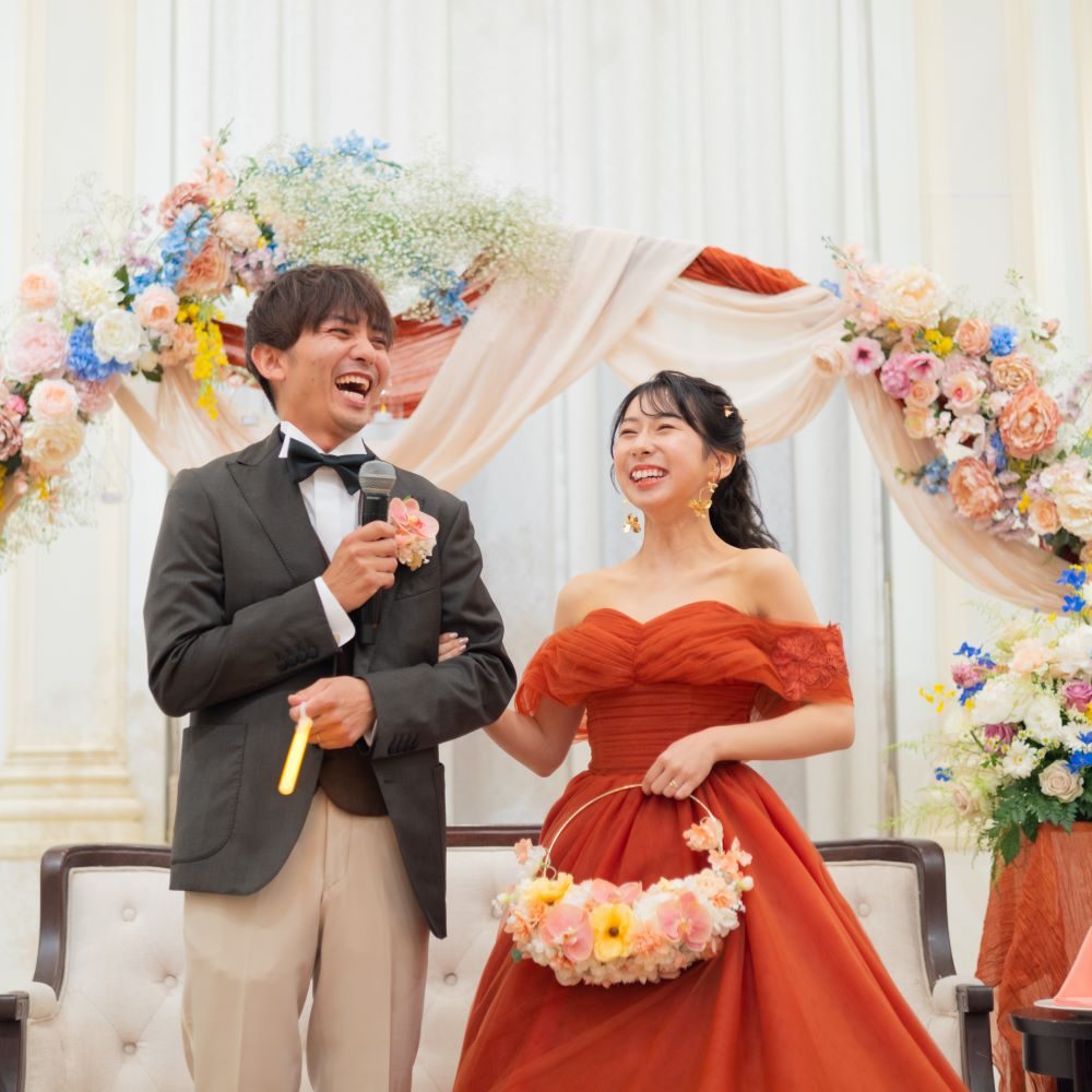 ゲストとの時間を大切にするために挙式は人前式で、披露宴では主に「主賓挨拶・友人スピーチ・両親記念日贈呈・両親謝辞」をカットしました。