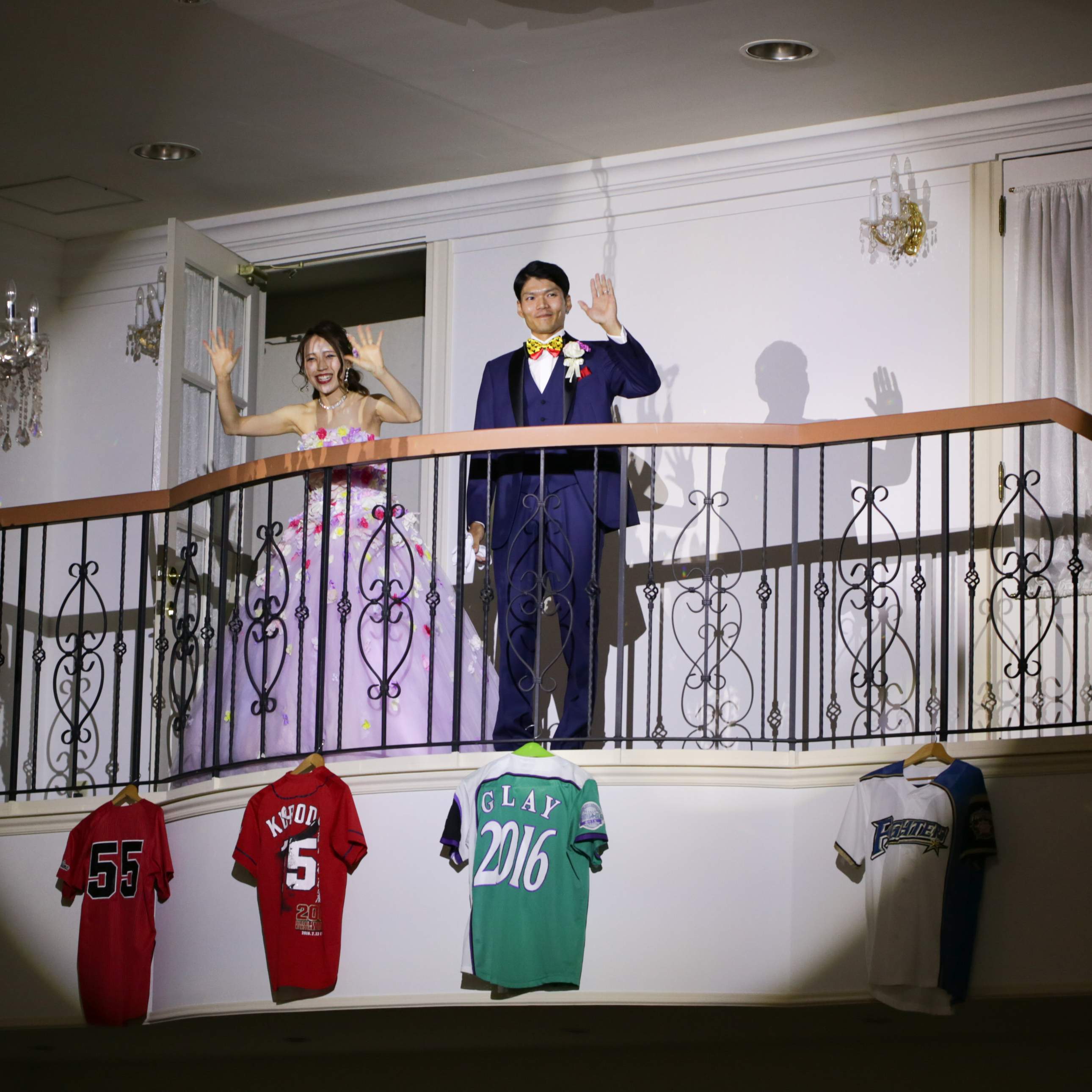 とにかく来てくださるゲストの皆様に楽しんでいただきたい!2人の好きなものを存分に取り入れたい!感謝の気持ちを伝えたい!沢山写真を撮りたい!とここには書ききれない程こだわりました。料理はとっても美味しいものにして、私達2人の(特に新婦が)大好きなバンドの曲を沢山流したり、ポスター等を飾りました。また夫婦で野球が好きなのでユニフォームもいっぱい飾りました。またゲストの皆様との思い出の写真をいーっぱい飾りました。そして当日もゲストの方と沢山写真を撮りたかったので、余興を行わずにテーブルフォトラウンドとキャンドルサービスを行い、2回皆様のテーブルをまわりました。
