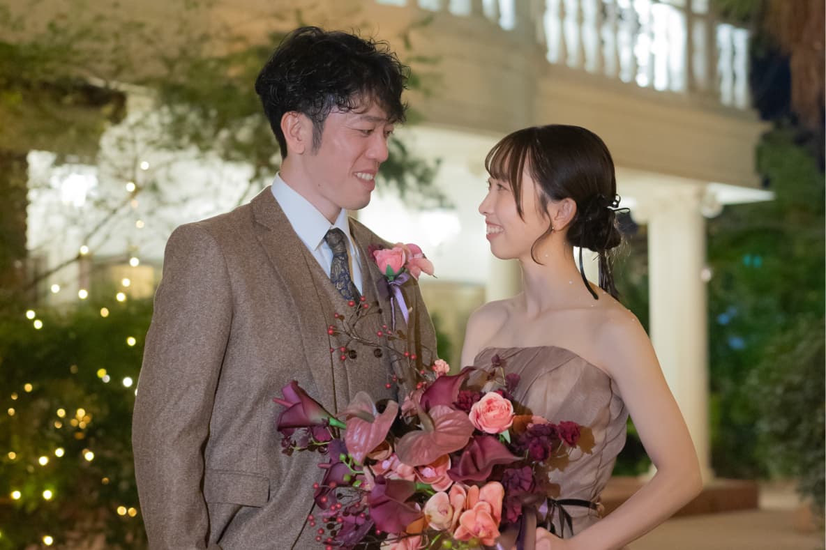 常に新婦様ファーストであり、ムキムキな新郎様と心が暖かく、とっても笑顔が素敵な新婦様です。 職場で出会われ、共通の趣味も多いおふたり。 ゲストが来て良かったと感じれるように【たくさんの感謝】を伝え、おふたりらしい時間になるように【美しい日】というテーマが生まれました。